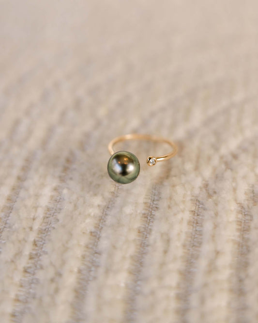14K Yellow Gold Green Tahitian Pearl Toi et Moi Ring